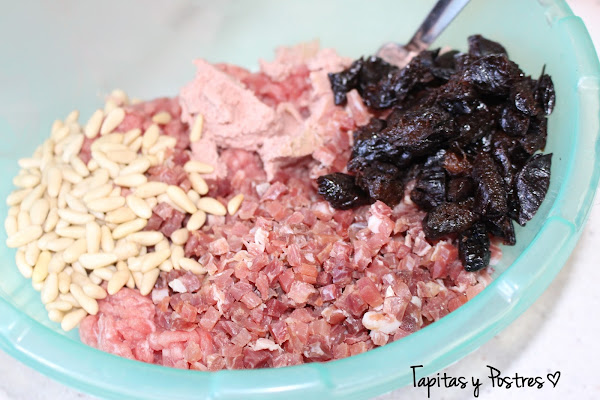 En un bol ponemos la carne picada, los piñones, el jamón, las ciruelas picadas y el paté. Lo mezclamos todo muy bien.