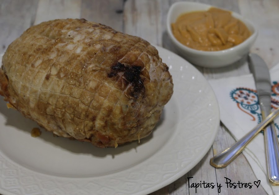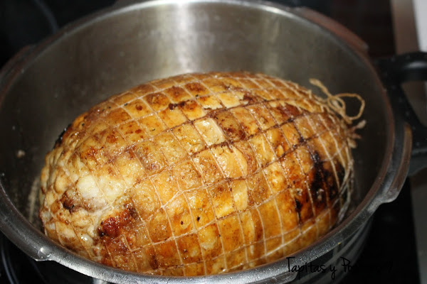 Guardar envuelto en papel de aluminio en la nevera hasta el día siguiente para poder cortar sin que se desmorone la carne. Servimos con la salsa caliente.