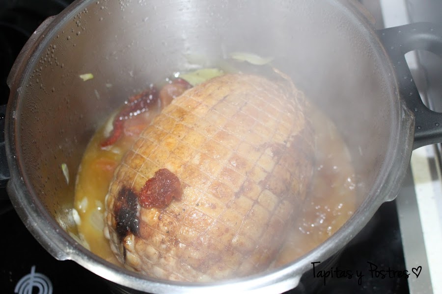 Agregamos el vino, el agua, los tomates secos, un puñado de orejones y el laurel. Lo dejamos cocinando unos 30 minutos.