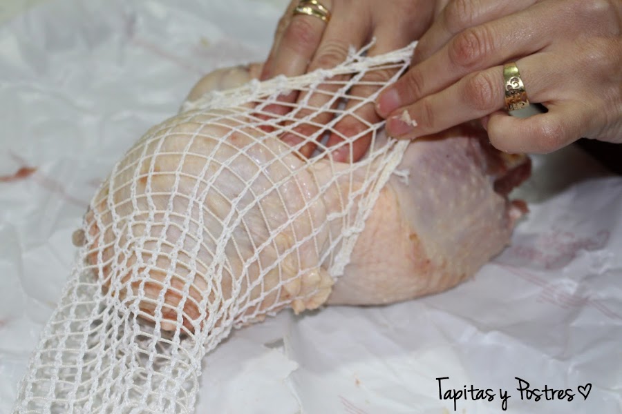 Cerramos los dos extremos haciendo un par de nudos. Ahora sazonamos por fuera.