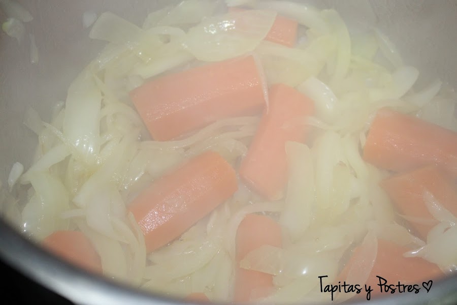 Ahora en la olla rápida ponemos a pochar las cebolla y las zanahorias en un fondo de aceite. Cuando esté transparente la cebolla introducimos el pollo.