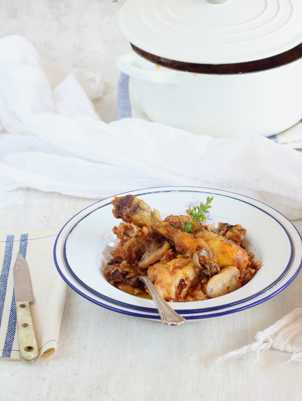En el mismo aceite doramos el pollo enharinado. Cuando veamos que ya está dorado añadimos las verduras troceadas (cebolla, puerro, zanahorias) la hoja de laurel y los ajos reservados y dejamos cocinar a fuego suave durante unos 30 minutos.