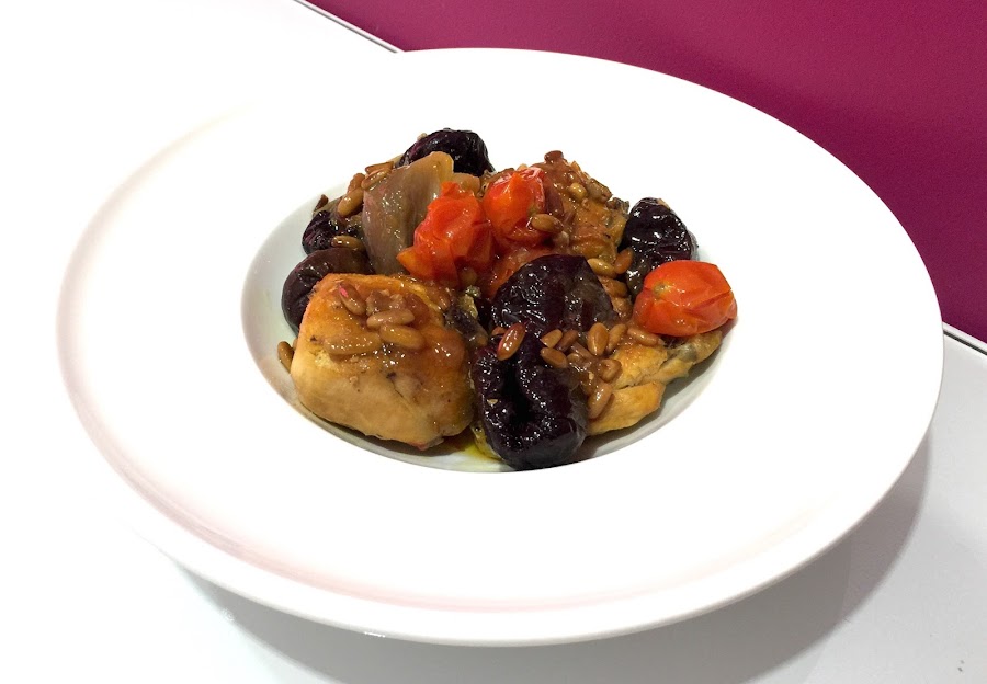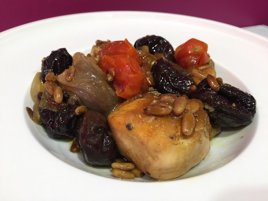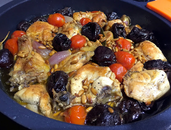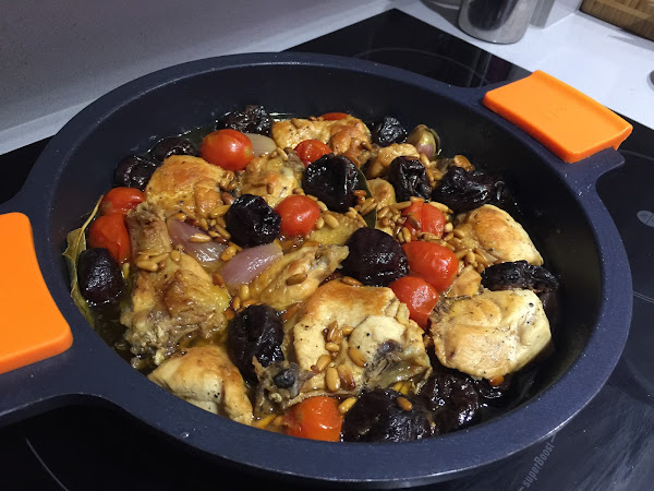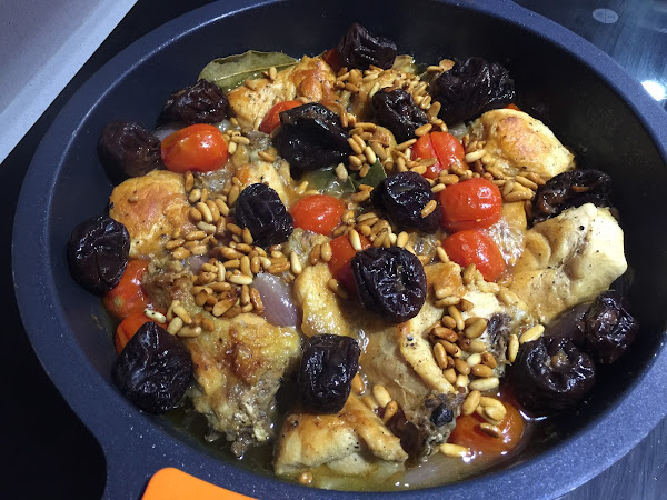 6. Cuando hayan pasado los 30 minutos añadiremos las ciruelas escurridas y los piñones tostados al rustido. Dejaremos a fuego bajo durante 10 minutos más.