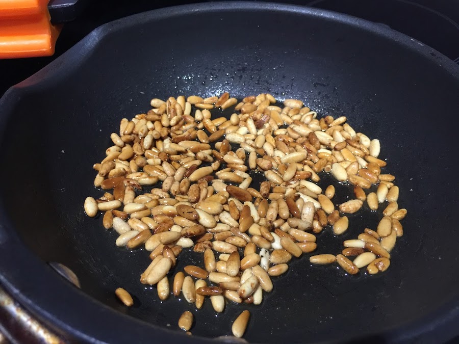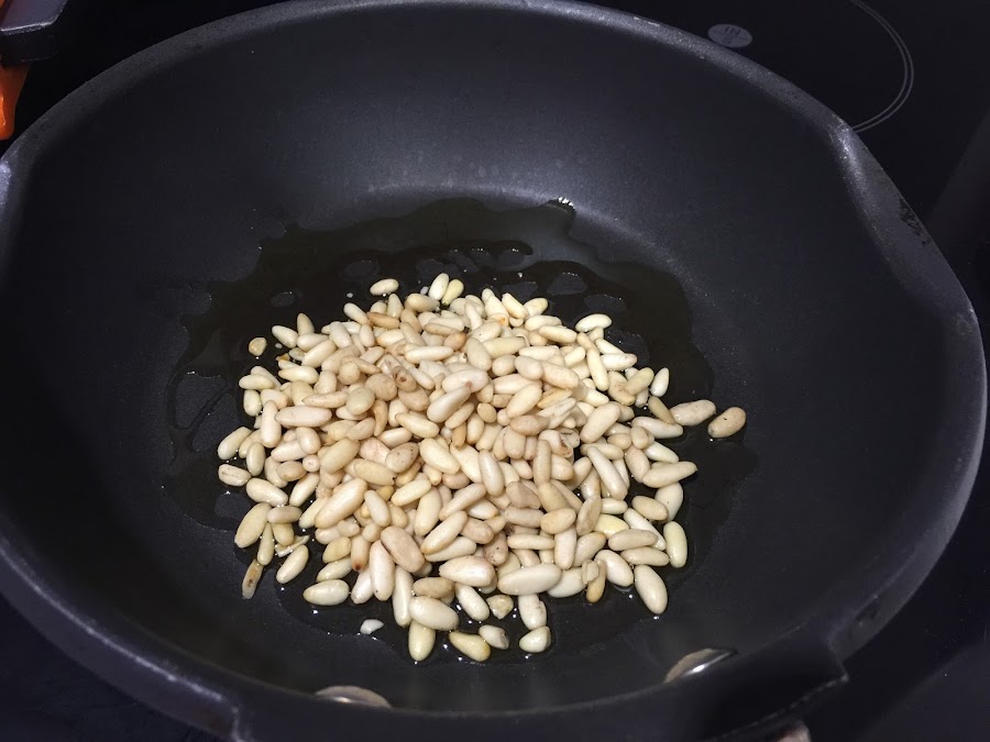 5. Mientras se va haciendo el rustido pondremos las ciruelas en agua caliente. Tostaremos en una sartén con aceite los piñones.