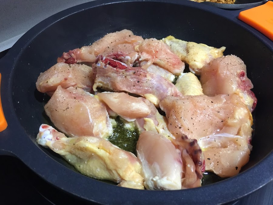 1. Salpimentamos el pollo troceado. Cubrimos la base de la cazuela con aceite de oliva virgen extra. A fuego alto doramos el pollo, le vamos dando la vuelta hasta que tome un buen color.