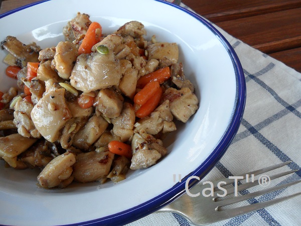 Se parten los filetes de pollo en cubos regulares y se añaden a la sartén en la que ya estaremos salteando la cebolla hasta dorar ligeramente.