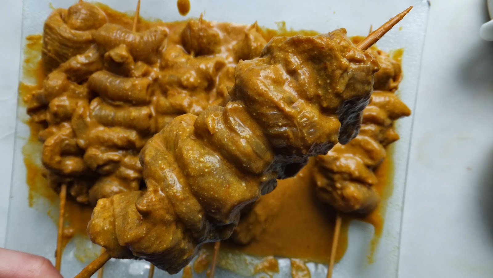 El pollo satay es un aperitivo clásico y exquisito de la comida callejera de Indonesia y de otros países del Sureste Asiático. La carne, que también puede ser de cerdo, ternera, marisco etc, es marinada, espetada en pinchos de bambú y asada a la parrilla. Se suele servir con salsa de cacahuete y verduras.