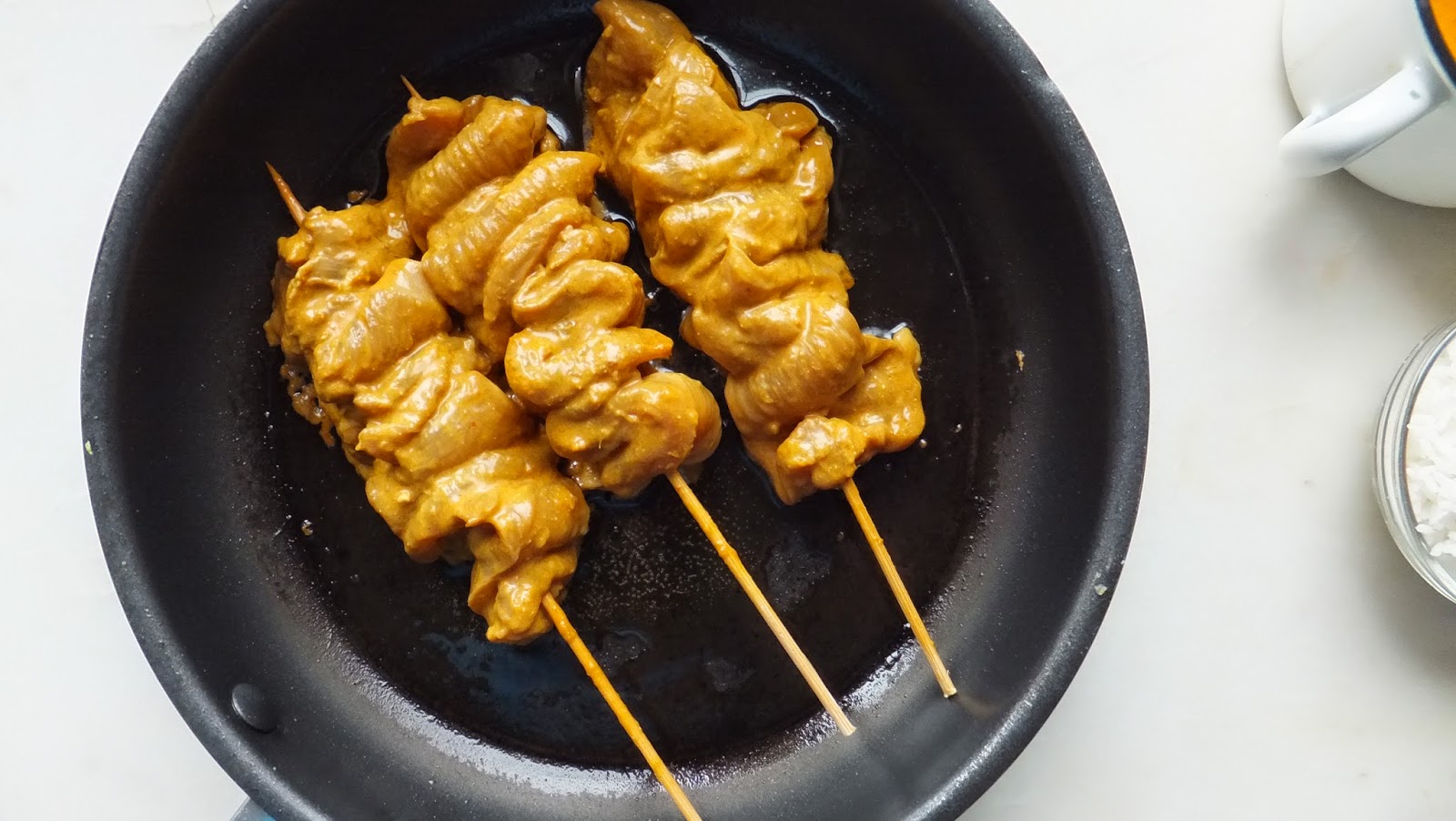 5. En una sartén antiadherente con un poco de aceite (o si tienes en una barbacoa mejor) y a fuego medio alto cocina los pinchos por los cuatro costados durante 5-10 minutos o hasta que todos los lados se hayan dorado bien y el pollo esté hecho. (Puedes hacerlos también al horno)