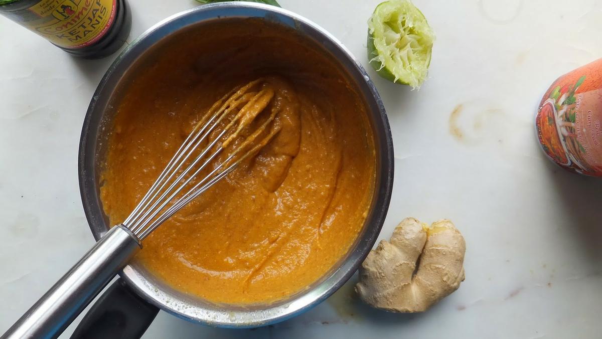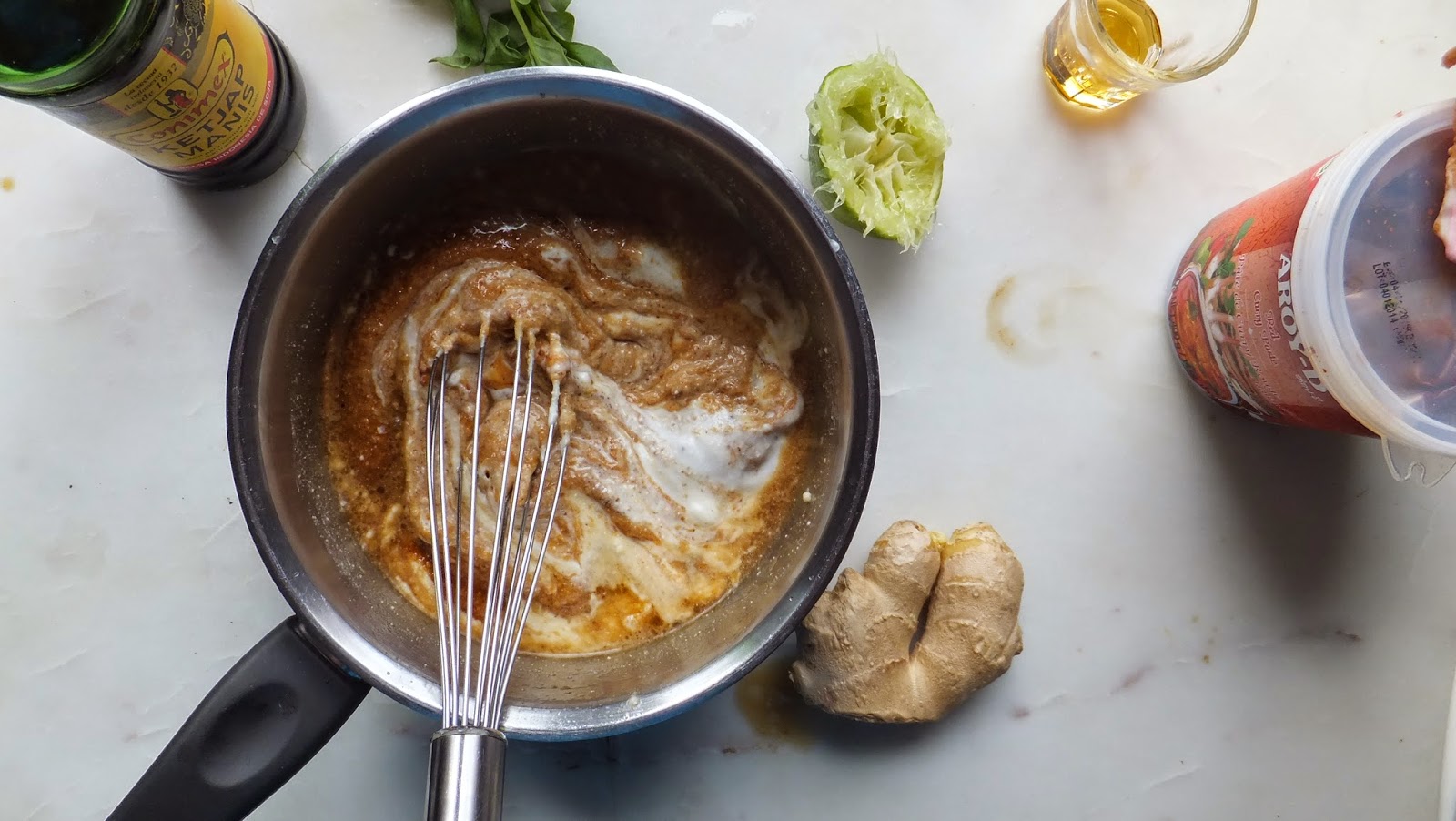 6. Para la salsa de cacahuete. La puedes preparar con días de antelación o mientras se hace el pollo. Para ello vierte todos los ingredientes excepto las hierbas frescas (si las utilizas) sobre una cazuela y cocina a fuego medio hasta que empiece a hervir. Prueba la sazón y haz los ajustes que creas convenientes. (Yo añadíi algo más de agua y de leche de coco para suavizarla un poco). Yo añadí albahaca fresca en hoja al final para dar a la salsa algo más de color y de frescor. Es totalmente opcional y puedes sustituirla por cilantro por ejemplo.