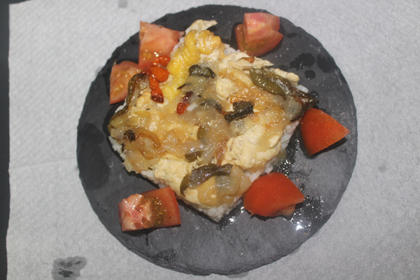 Sobre el arroz colocamos la cebolla y el pimiento.