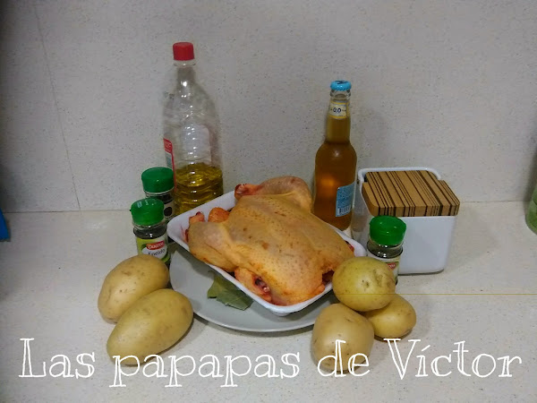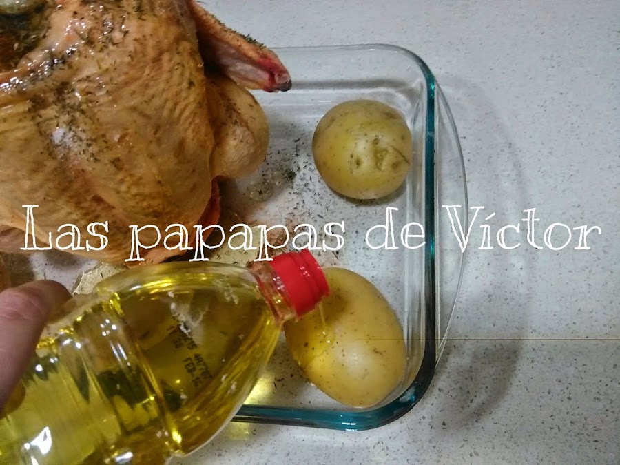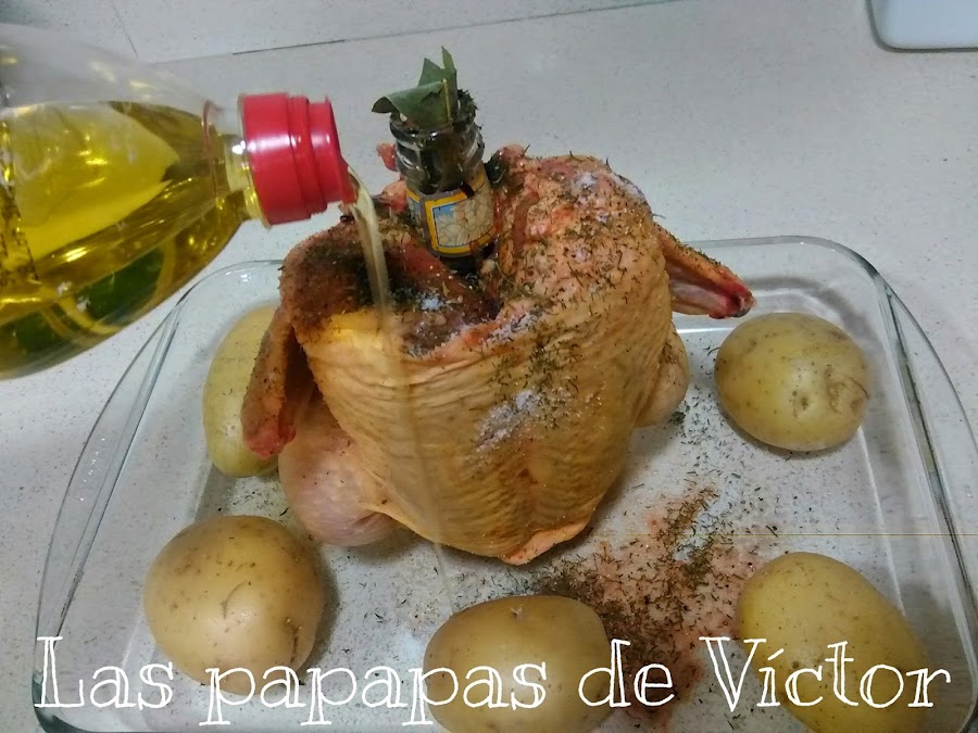 Dentro de la botella abierta claro.. Poner las hierbas provenzales y el laurel, al lado de la fuente las patatas y salpimentar el pollo y poner aceite