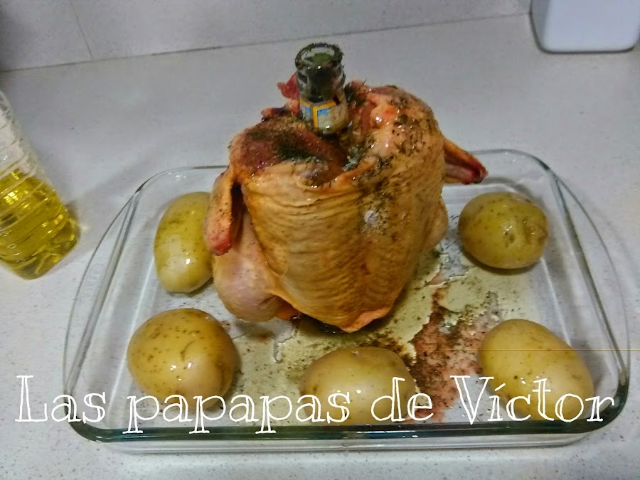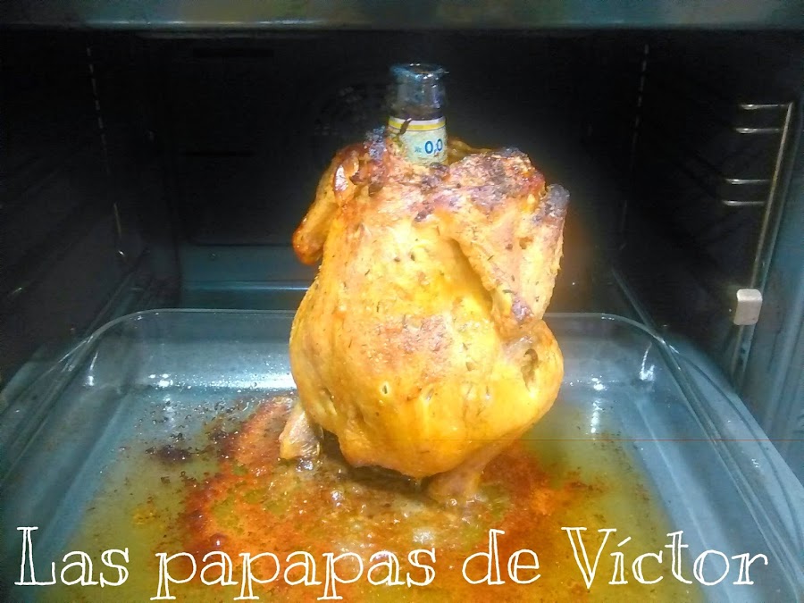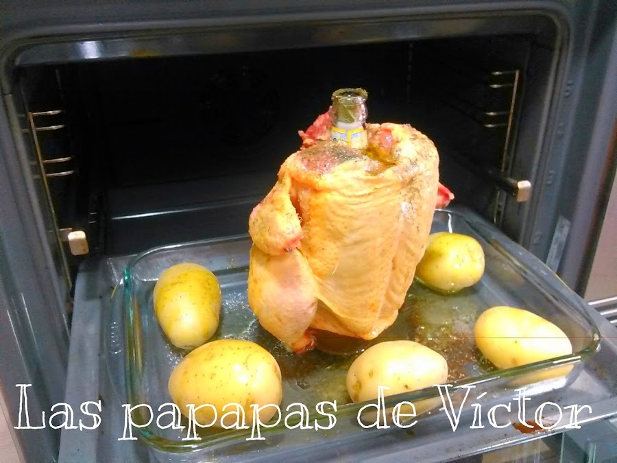 Poner en una bandeja de horno el botellin de cervexs y vulgarmente,, introducir la botella por el culo de dicho animal..