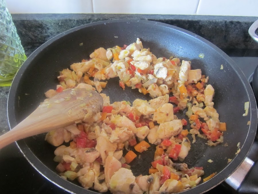 Vamos pochando todo, que quede bien hecho, añadimos el pollo y rehogamos.