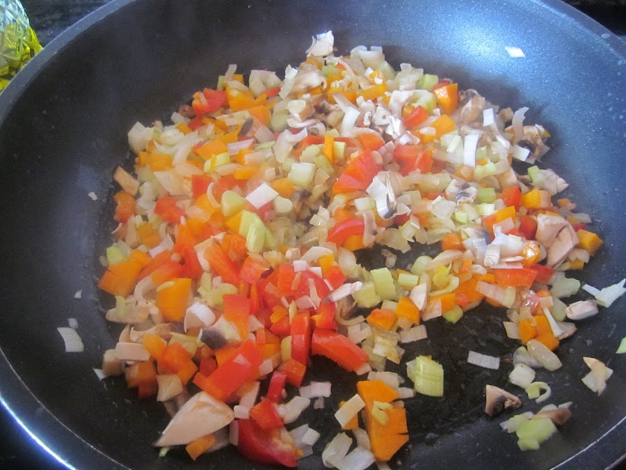 Ponemo aceite a calentar y empezamos sofríendo la cebolla picadita a fuego lento, mientras vamos preparando el resto de las verduras, cortamos el apio, el puerro, el pimiento, la zanahoria, todo pequeñito, y añadimos las verduras al sofríto.