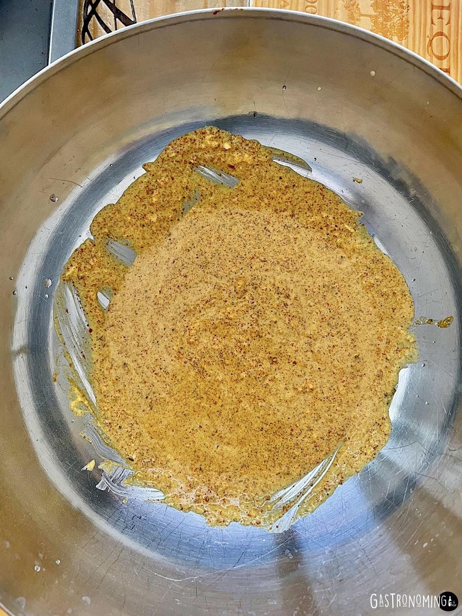 3. En un bol colocamos el yogur, jengibre, ajo, zumo de limón, además del cilantro y todas las especias restantes, mezclamos bien hasta tener una “pasta” homogénea.