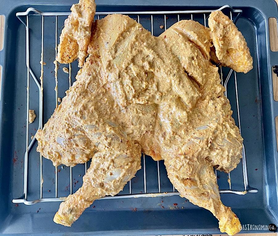 1. Pre calentamos el horno a 190ºC. y ponemos en función calor arriba y abajo.2. Le hacemos al pollo un corte mariposa, le quitamos la espina dorsal y lo abrimos bien, ahora le hacemos corte longitudinales a las pechugas y muslos para que le entre bien el aderezo. Rociamos el pimentón por todo el pollo frotándolo bien.