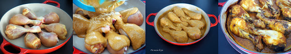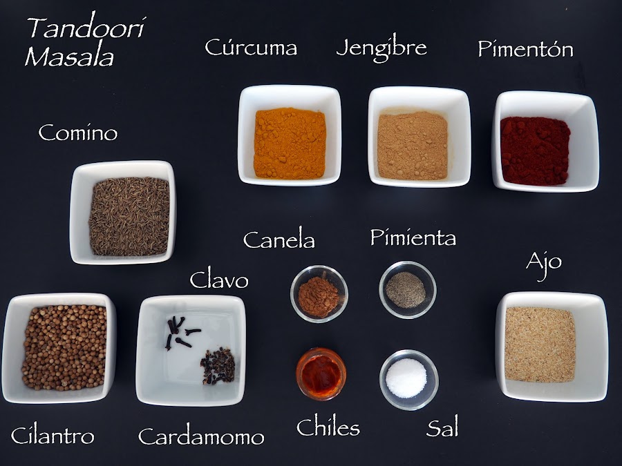Untarlos bien con la mezcla de tandoori, añadir el resto por encima y dejar marinar un mínimo de una hora, que la carne se impregne del aroma de las especias.