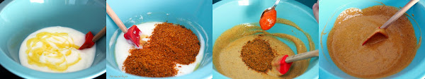 Colocar el yogur en en un bol y añadirle un chorro de aceite de oliva y una pizaca de sal. Mezclarlo con unas 5 cucharadas de la mezcla de especias y una cucharadita de la pasta de chiles y remover bien hasta que quede todo integrado.