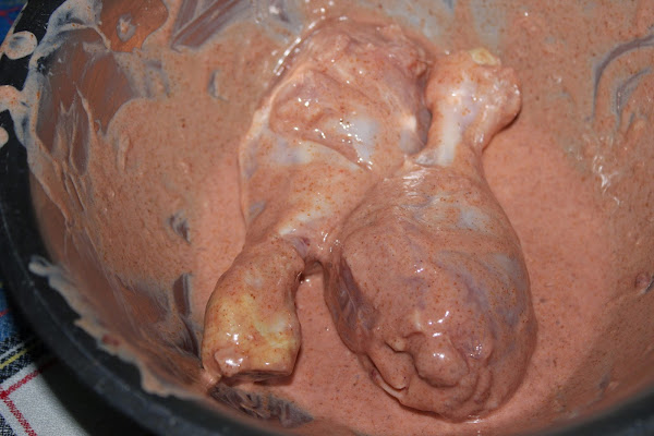 Después hacemos unas sajas en los muslos de pollo, quitamos la piel, untamos todo el muslo de pollo con la mezcla que hemos preparado y lo dejamos macerar como mínimo 12 horas en la nevera.