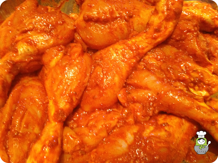 Mezclamos en un bol grande el pollo con el adobo hasta que esté todo bien impregnado. Os recomendamos que utilicéis unos guantes para adobar el pollo, porque el tinte rojo del tandoori mancha bastante.