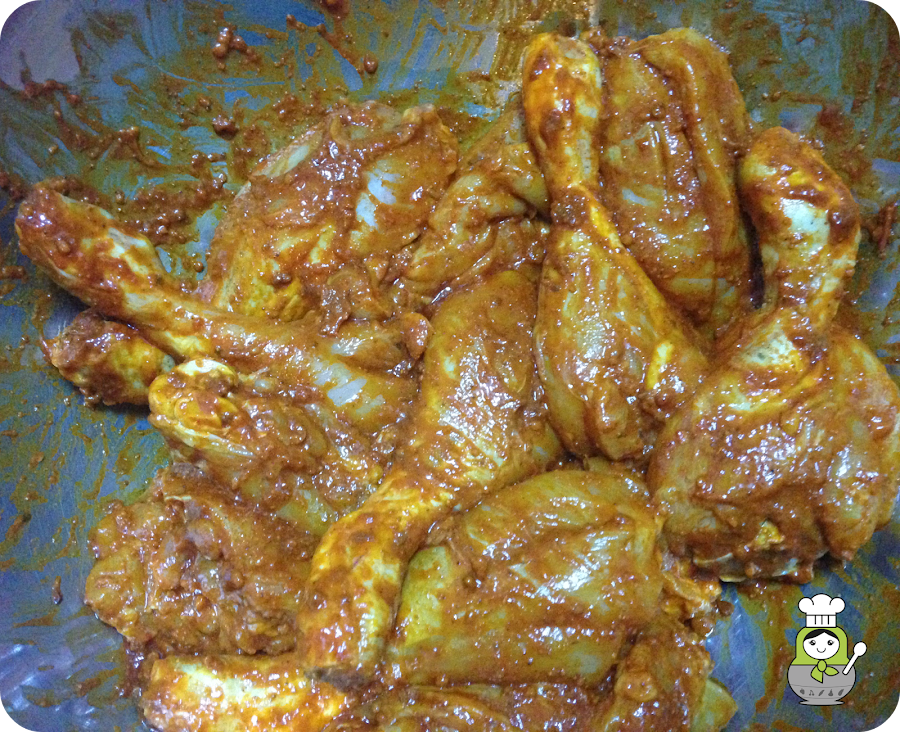 Lavamos bien el pollo y realizamos varias incisiones con un cuchillo en cada trozo de pollo. Así penetrará bien el sabor de las especias. Para esta receta es preferible escoger zonas del pollo con piel y jugosas como los muslos, contramuslos, etc. y, en cambio, nada recomendable la pechuga que quedaría demasiado seca.