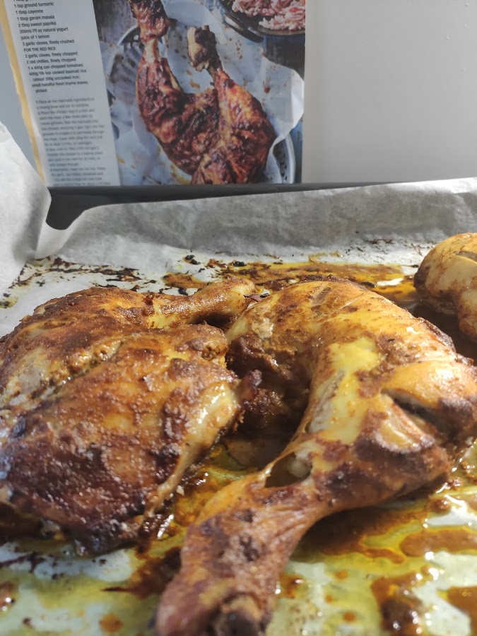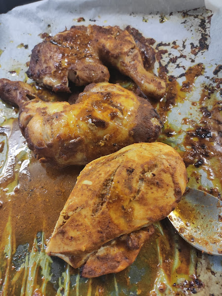 Forramos una bandeja de horno con papel sulfurizado. Colocamos el pollo sobre éste y horneamos por espacio de 45 minutos o hasta que esté hecho por dentro.