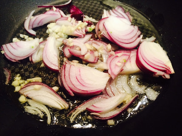 En una sartén tipo wok, ponemos 2-3 cucharadas de aceite de oliva y ponemos los ajos pelados y picados en brunoise (cuadraditos) y la cebolla morada en juliana (tiras) y lo pochamos a fuego medio durante 5 minutos aproximadamente.