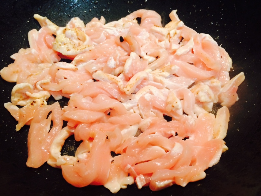 En la misma sartén, con una cucharada de aceite de oliva, añadir la pechuga de pollo cortada a tiras, salpimentar y dorarlas.