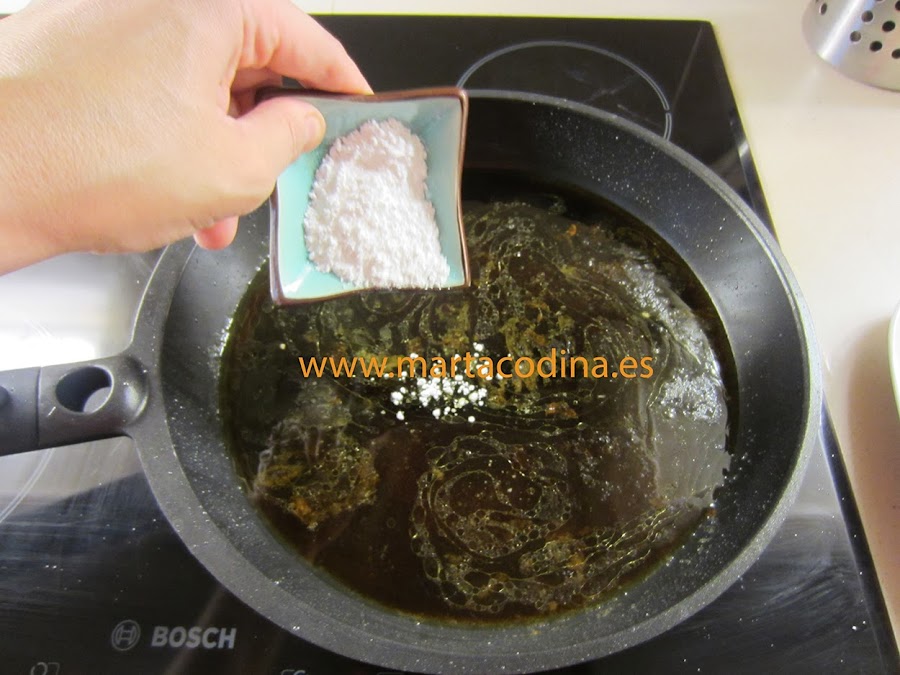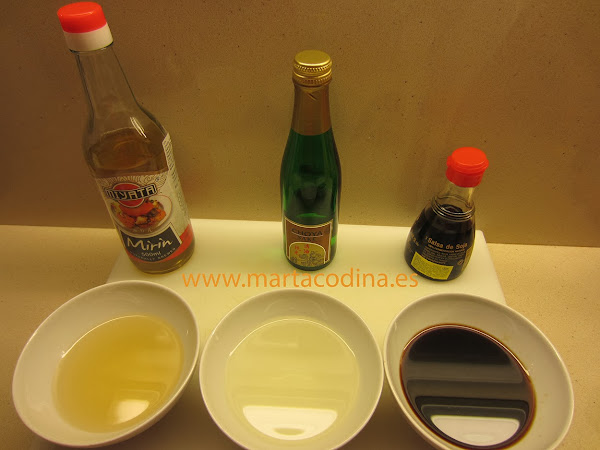 Desglasamos con el mirin, el sake y la soja. Añadimos el azúcar y mezclamos bien, removiendo hasta que se disuelva. Dejamos hervir unos 5 minutos, hasta que espese y obtenga un color dorada tostada.