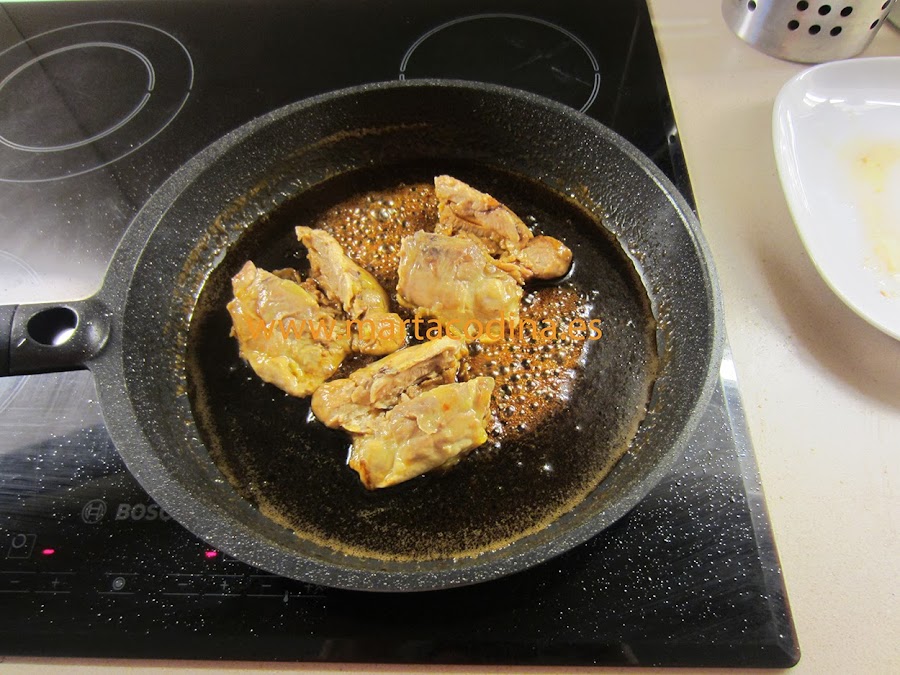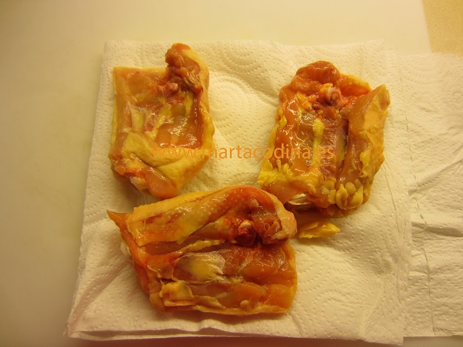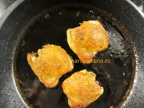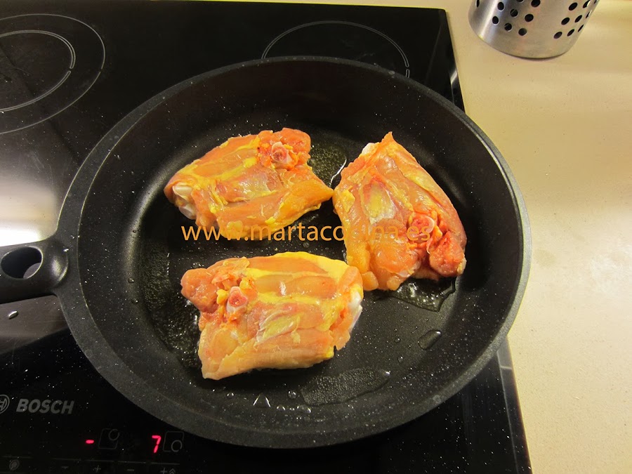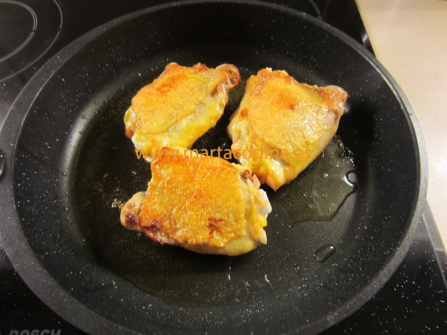 Echar el aceite en una sartén. Cuando esté caliente, cocinar el pollo por el lado de la piel unos 15-20 minutos a fuego medio, hasta que veamos la piel dorada y crujiente. Le damos la vuelta y cocinamos tapado unos 10 minutos. En el caso del contra-muslo, le sacaremos el hueso. Reservamos.
