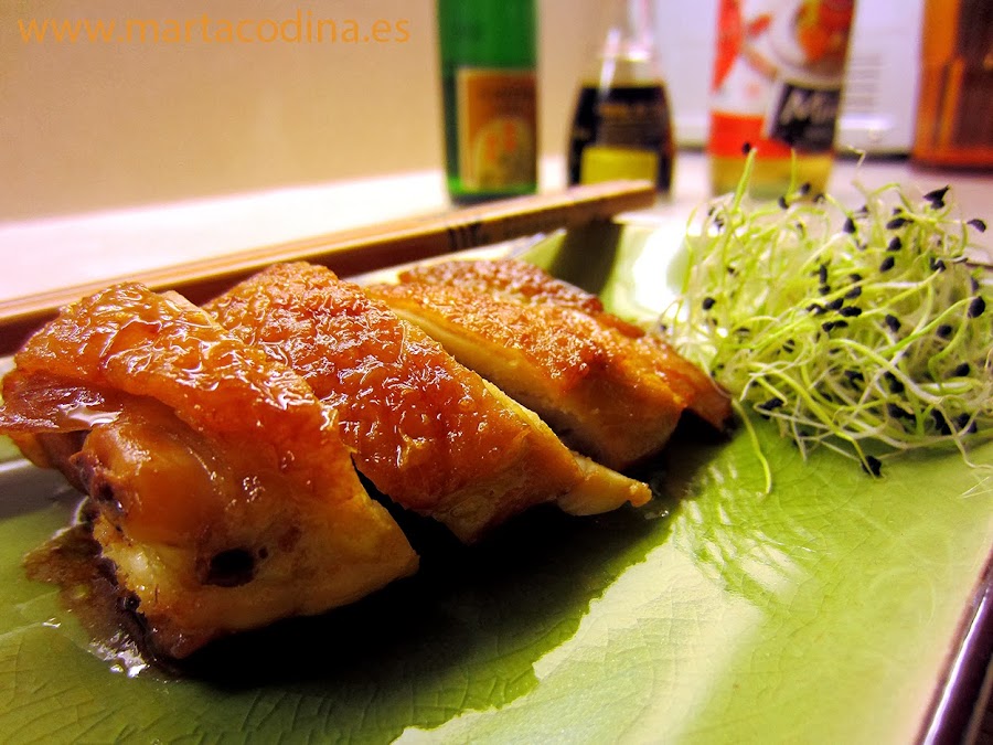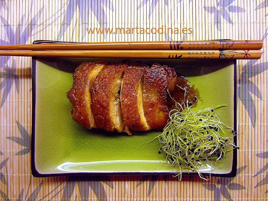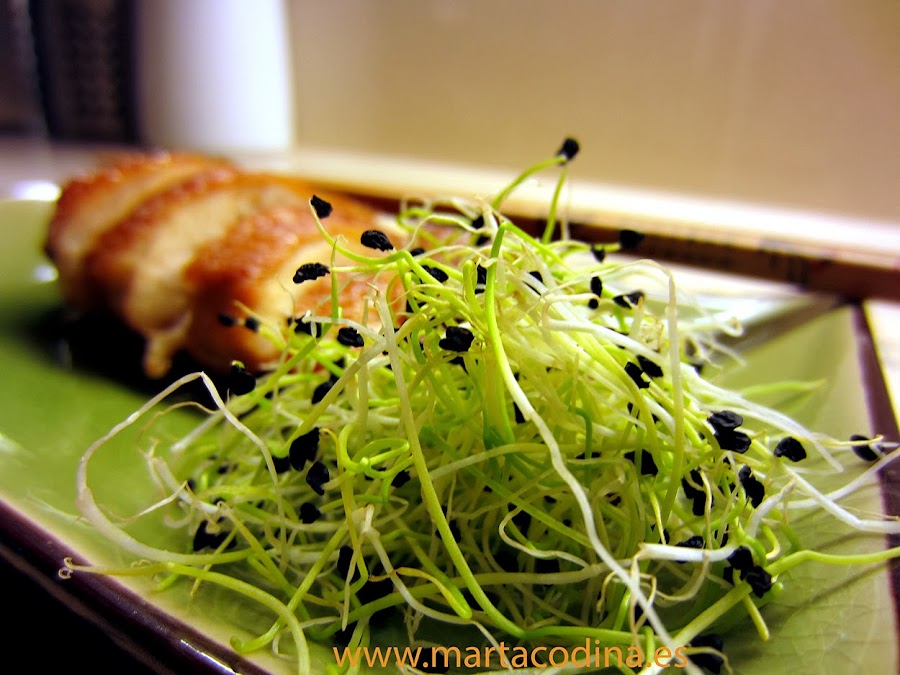 Presentamos el pollo cortado en lonchas y acompañado de algún alimento que le aporte frescor, en este caso, he utilizado unos brotes de germinado de cebolla.
