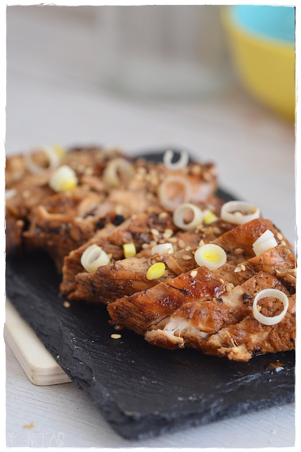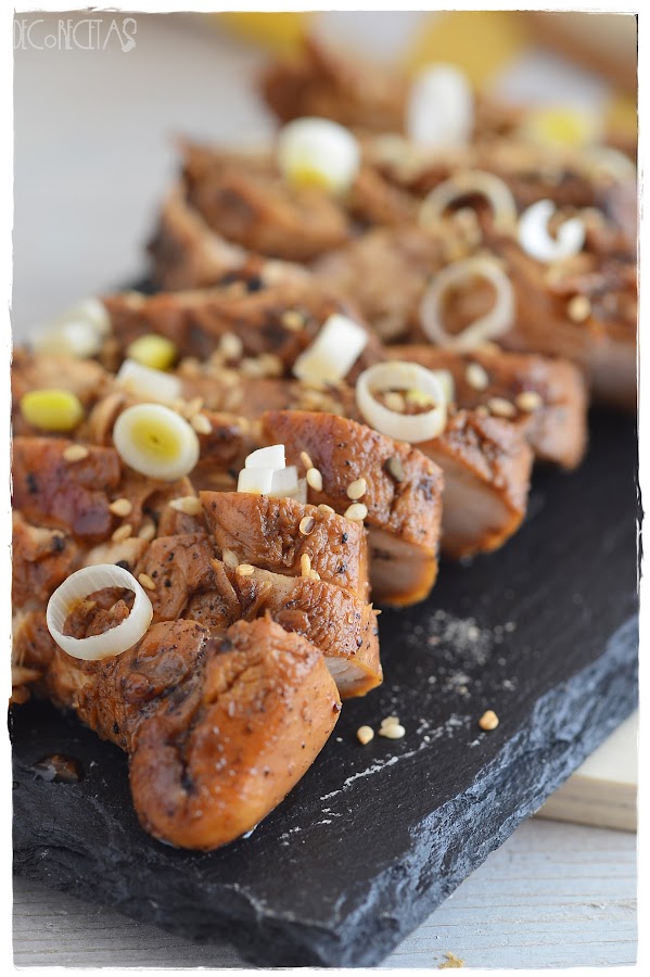 Para hacer la salsa, mezclamos 10 cucharadas de salsa de soja, 4 cucharadas de vinagre e arroz, dos cucharadas de azúcar moreno, y media cucharadita de ajo en polvo y otra media de jenjibre molido. Esta mezcla la pondremos a fuego bajo hasta que reduzca ligeramente.