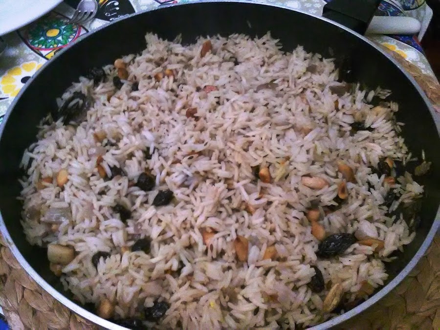 Tapamos comprobando regularmente que el arroz no se pegue. Dejamos cocer hasta que casi absorba todo el agua. Apagamos y dejamos reposar al calor con el fuego apagado pero sin retirar la sartén. Incorporamos las almendras y las pasas.