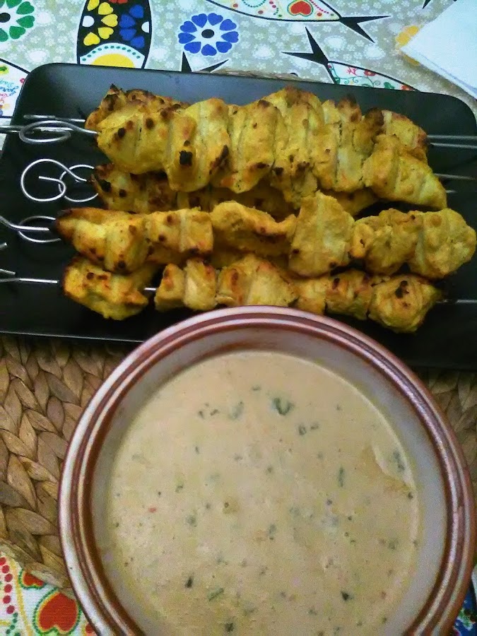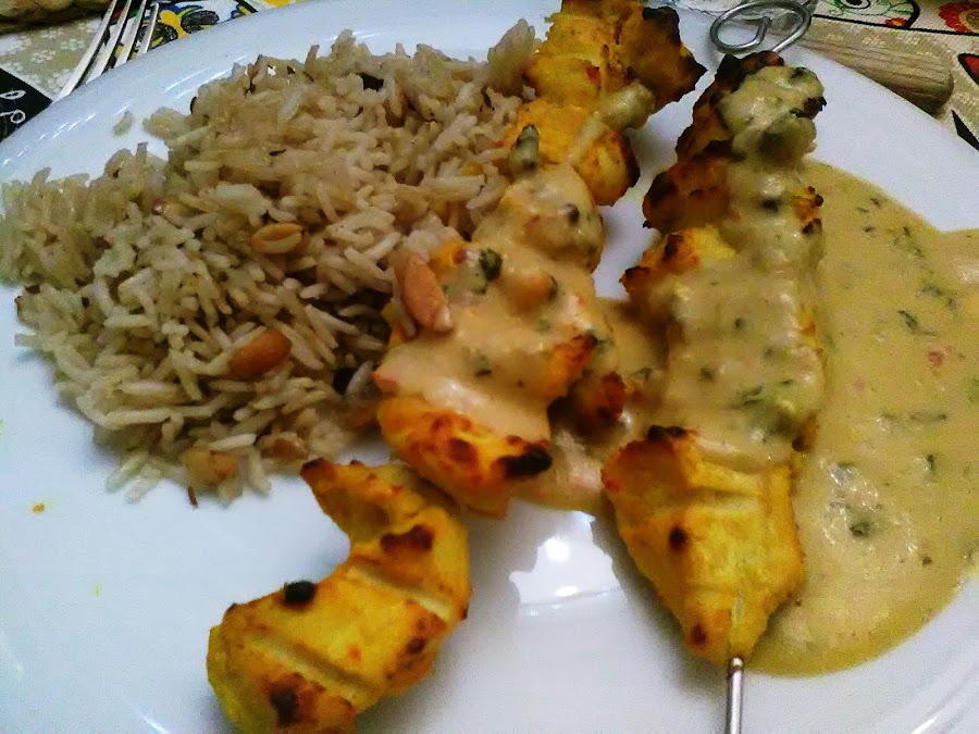 Servimos el tikka de pollo con la salsa y el arroz pilaf.