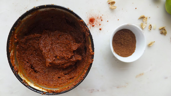 2. En un molinillo o en un mortero muele primero las especias enteras (pela el cardamomo antes de trituralo) y cuando estén completamente molidas añade el resto de ingredientes de la pasta. Si la pasta queda un poco seca añade agua o aceite para soltarla. Reserva.