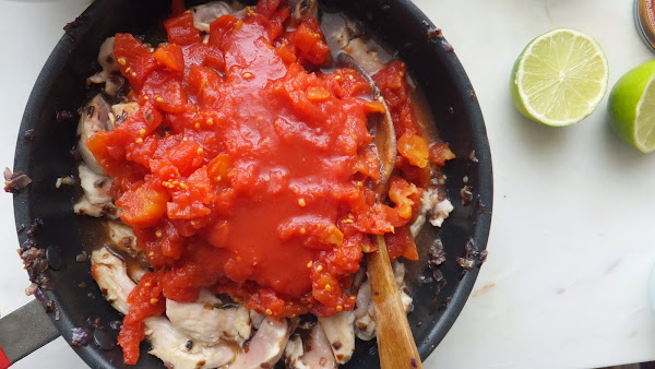 5. Añade el pollo y remueve de nuevo. (Yo en un despiste habitual en mi eché primero el pollo y después el tomate. No pasa nada por hacerlo así pero el resultado es mejor y el pollo queda más tierno si se cocina el tomate antes de echar el pollo, especialmente si utilizas tomate fresco)