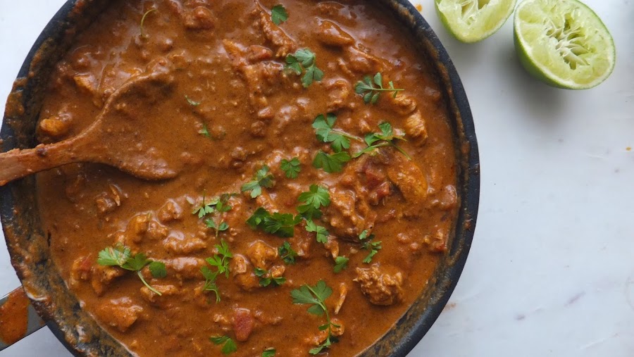 "(?) En una típica noche de Glasgow, oscura y húmeda, un conductor de autobús vinó a nuestro restaurante y nos pidió un pollo al curry. El cliente nos devolvió el plato, argumentando que estaba seco. En esa misma noche, mi padre estaba enfermo y estaba tomando una sopa de tomate, así que nos sugirió poner un poco de sopa en el curry con algunas especias. Lo servimos de nuevo en la mesa y el conductor quedó prendado. De tal manera que este volvió con sus amigos una y otra vez, tomando nosotros la decisión de incluirlo en el menú." La declaración anterior la hizo el hijo del presunto autor del plato para la BBC británica en 2013 (traducida amablemente por indian city). Es probablemente la leyenda más difundida sobre el origen del pollo tikka masala, sospecho que debido a su carácter literario, y situa la invención del plato en el restaurante hindú Shish Mahal de Glasgow. Existe otra variante de la misma anédota ambientada en Londres y por supuesto no son las únicas. Así, algún chef de Delhi, objeta que sus antepasados ya lo cocinaban para los emperadores mongoles de la India en el periodo Munghali y también habrá quien afirme que fue su tía abuela fue quien dio con la receta al no saber que hacer con las sobras del pollo asado de la cena de navidad. Las fuentes más serias, reconocidos críticos culinarios de la India y demás, afirman que el tikka masala se invento muy lejos de las islas británicas, concretamente en el corazón de la región del Punjab, durante la ocupación británica, como una variante occidentalizada del Butter Chicken, pollo con mantequilla o Murg Makhani. Y lo cierto es que los dos curris son tan similares que es frecuente confundirlos entre sí. La mayor diferencia consiste en que el pollo tikka masala obtiene su cremosidad principalmente de la adicción de la nata (crema de leche) o leche de coco mientras que el pollo con mantequilla, como su propio nombre indica, lo obtiene de la mantequilla.