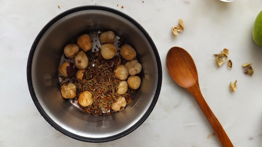 1. Tuesta en una sartén a fuego medio bajo el comino, el clavo, las avellanas y la piemienta cayena. Retira del fuego en cuanto empiecen a soltar aróma. (Cuidado porque se quemán facilmente y si lo hiceran amargarían)