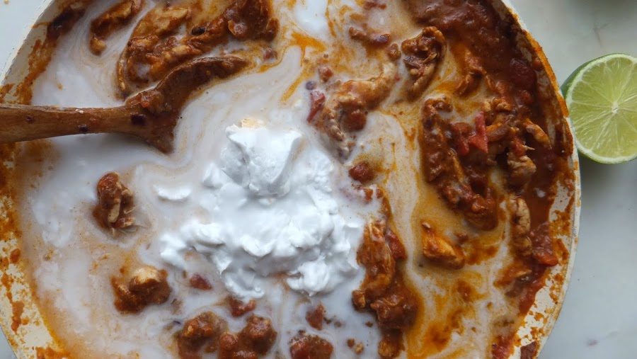 8. Cuando esté listo añade el zumo de media lima (o más si lo crees conveniente) y el yogur. Remueve bien y rectifica la sazón si fuera necesario.
