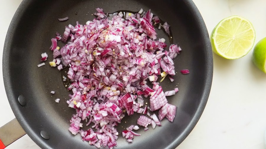 3. Calienta una sartén con aceite y rehoga la cebolla con un poco de pimienta y de sal hasta que esté tierna y haya comenzado a dorarse. (Fuego medio alto)