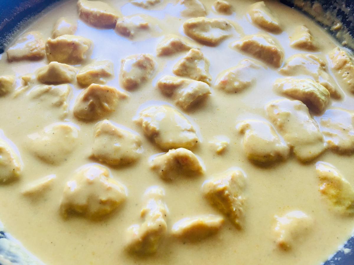 5º. Pasado ese tiempo, añadimos el pollo junto al tomate y la leche de coco. Cocina 45 minutos a fuego medio/bajo con la sartén o la olla tapada. Si vas a usar Thermomix, usa el cubrecuchillas o contramuslos deshuesados con giro a la inversa y velocidad cuchara, junto a los tomates cortados en dados y la leche de coco. Programa 30 minutos/100º. El pollo debe quedar muy tierno.