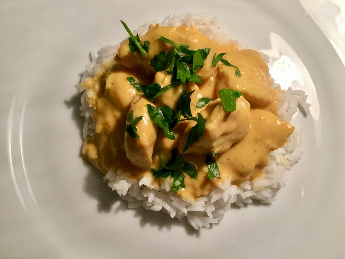 Sirve acompañado de arroz basmati cocido. Puedes ponerle un poco de cilantro o perejil picado por encima para decorar.
