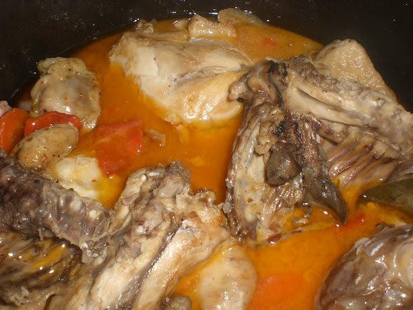 Hoy preparaba para mi marido conejo guisado, que le gusta mucho. Y como a mí el conejo no me dice demasiado, he aprovechado el mismo guiso para hacerme pollo para mí.
