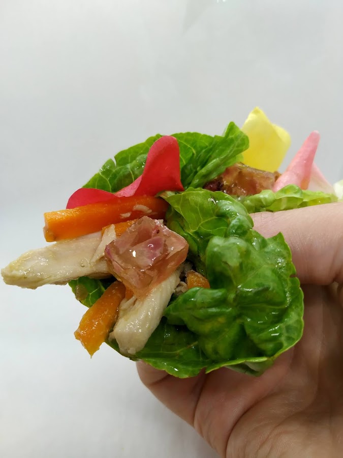 Disponemos las hojas limpias de la lechuga. Sobre ellas ponemos el pollo en escabeche con las verduritas y coronamos con la gelatina en trozos y los pétalos de rosa. Regamos con el escabeche, enrollamos y ¡A disfrutarlo!