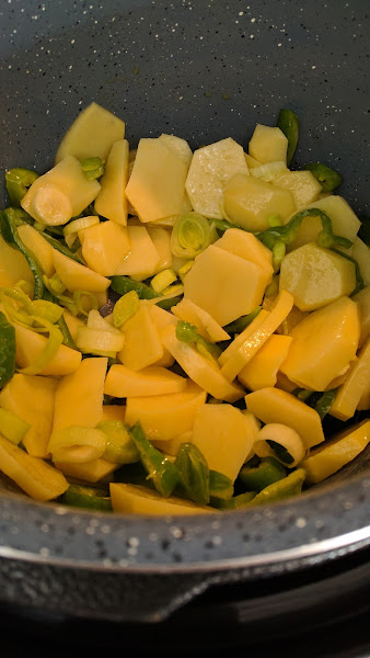 Pela y corta en panadera no muy fina 3 patatas medianas, 2 pimientos verdes italianos y 1 cebolla pequeña (estos en juliana) Calienta un chorrito de AOVE, menú guiso a 140 grados. Echa las verduras reservadas y saltea tres minutos. Cancela el menú y sala ligeramente