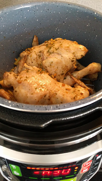 Encima de las patatas pon la rejilla de la olla (no tocará el fondo) Acomoda los picantones y vuelve a pintarlos. Cierra y programa menú horno 20 minutos y válvula cerrada.