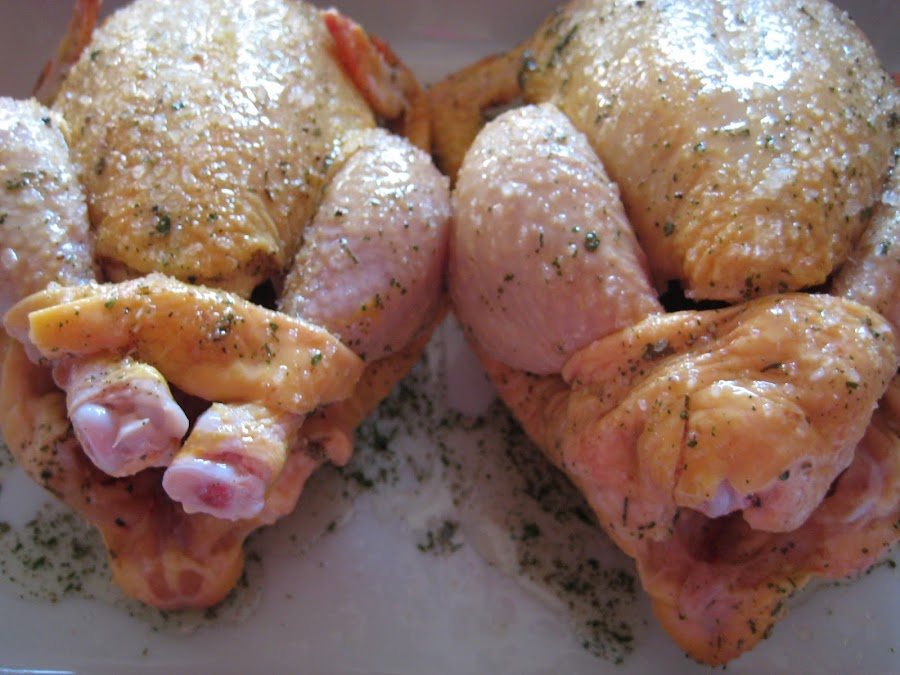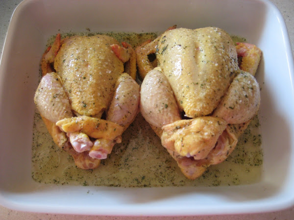 Untar los pollos tomateros con el adobo por dentro y por fuera, poner en una fuente de horno y cubrir con film, a la nevera hasta que los queramos cocinar.