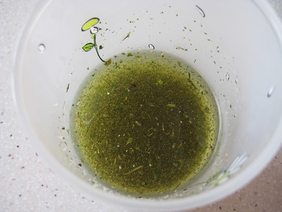 El día anterior le haremos el adobo, para ello ponemos en un vaso aceite de oliva, perejil, ajo picado, pimienta negra, pimienta blanca y sal. (Si no podéis pues hacerlo en el momento)