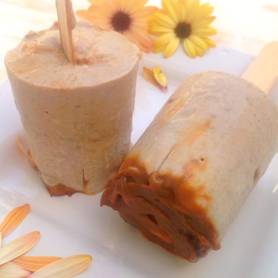 Ponemos una cucharadita de dulce de leche en el fondo del vaso, rellenamos un tercio del vaso y lo llevamos al congelador (freezer) durante 30 minutos. Reservamos el resto de banana con nata (crema de leche), tapándola para que no se oxide demasiado. Añadimos una o dos cucharadas de dulce de leche y mezclamos pero sin integrar para que se vean las vetas de dulce de leche. Retiramos el vaso del congelador, le ponemos el palito de helado y rellenamos con el resto de la crema de banana, nata (crema de leche) y dulce de leche. Dejamos congelar durante 3 horas.