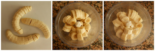 Pelamos y troceamos las bananas, las ponemos en un procesador o en la licuadora y añadimos la nata (crema de leche), triturando bien.